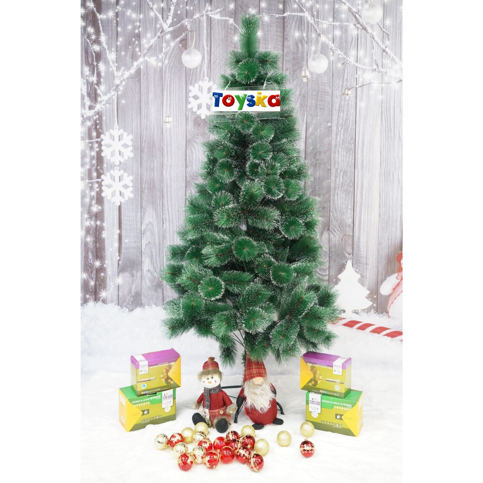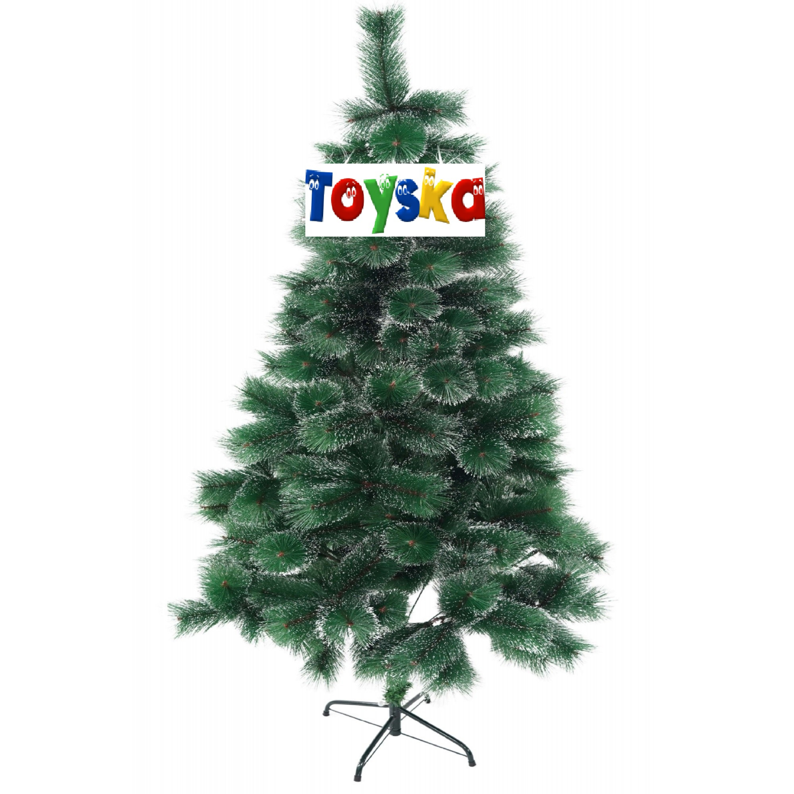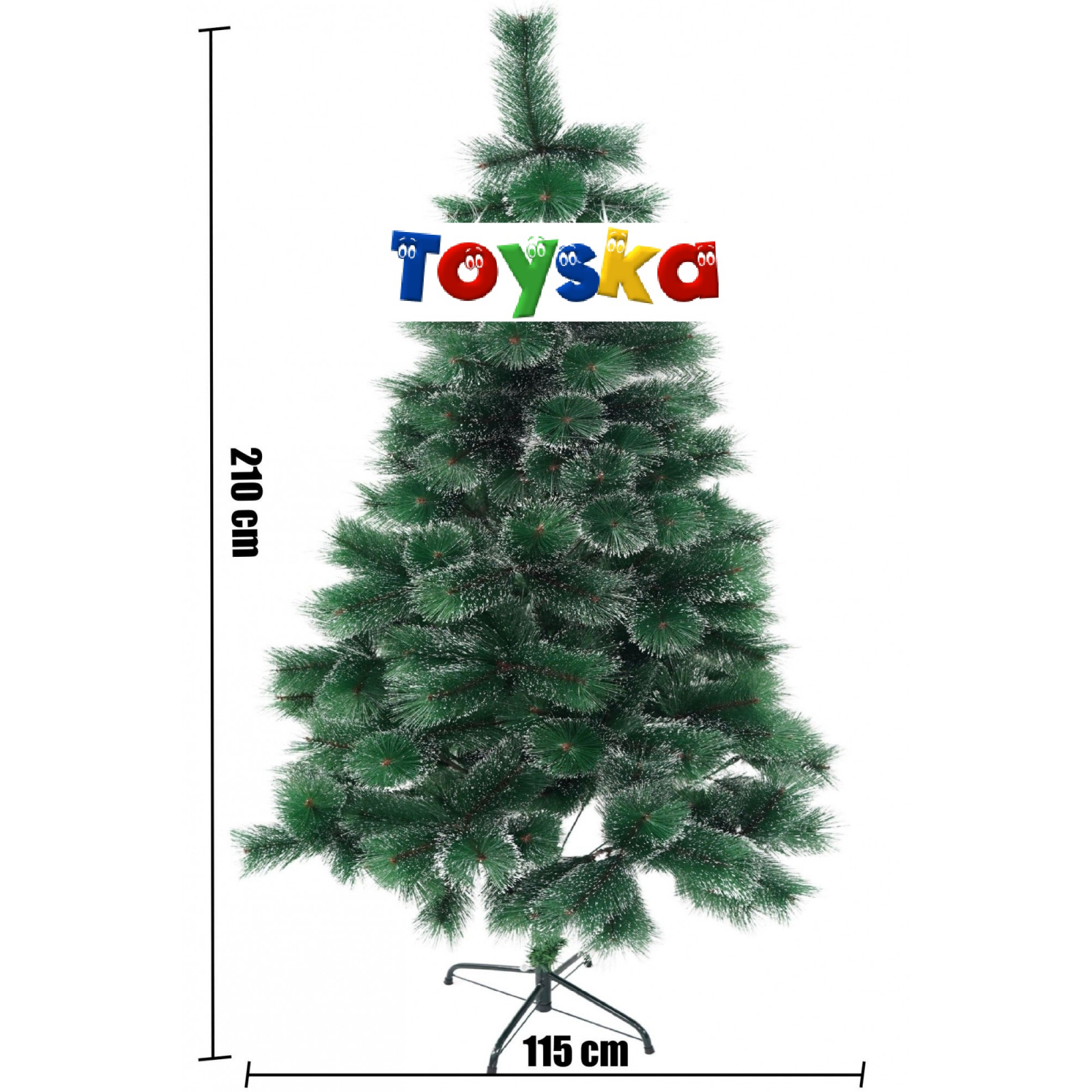 Brad artificial tip pin inzapezit, inaltime 210 cm, verde cu varfuri ninse, suport metalic inclus
