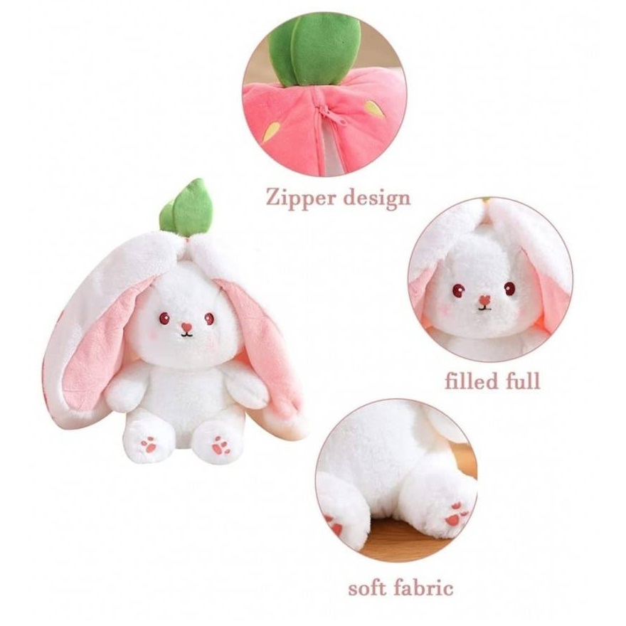 Iepurasul se ascunde intr-o capsunica roz, moale si placuta la atingere. Cand deschizi fermoarul, descoperi un iepuras jucaus si adorabil!