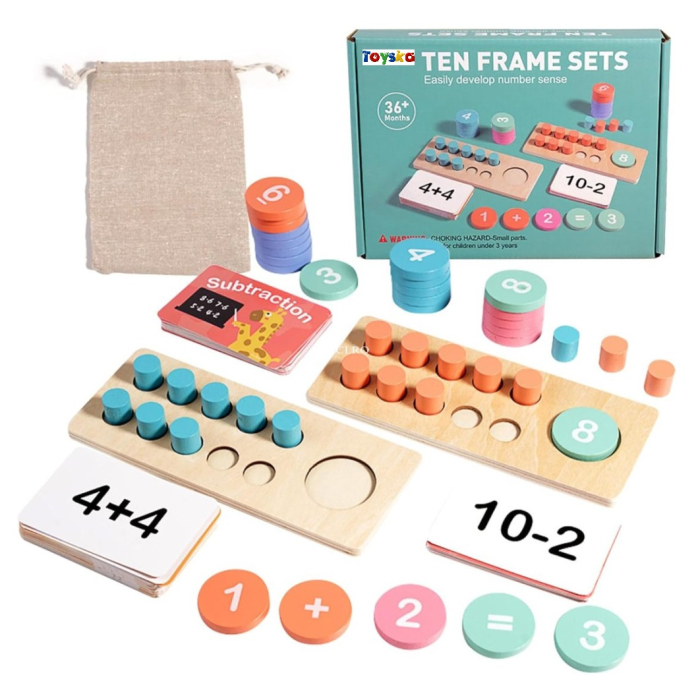 Joc Educativ din lemn cu adunari, scaderi si numarat Ten Frame, multicolor