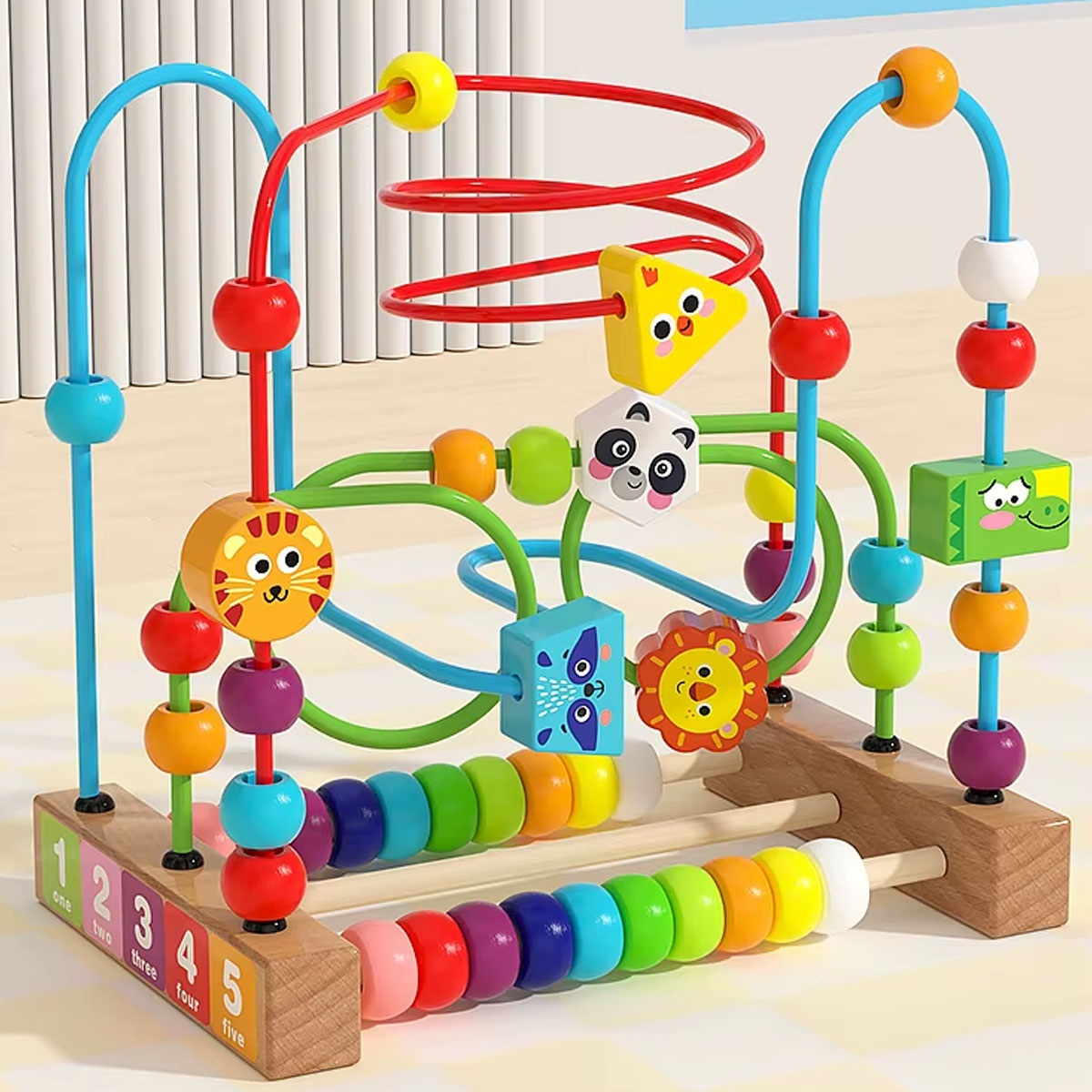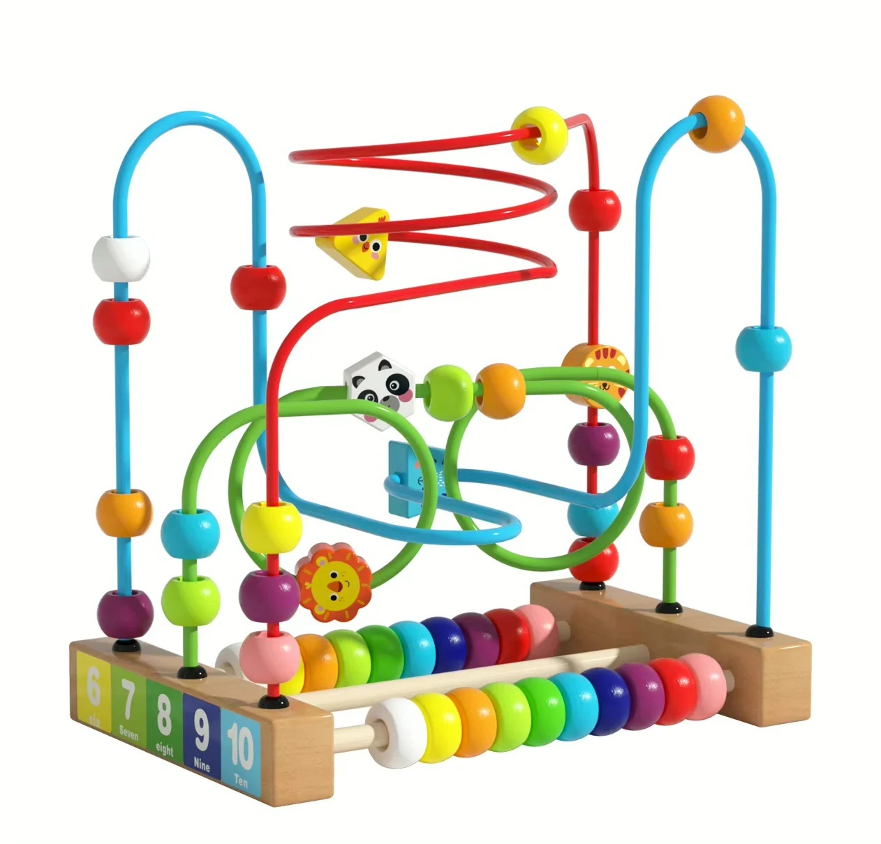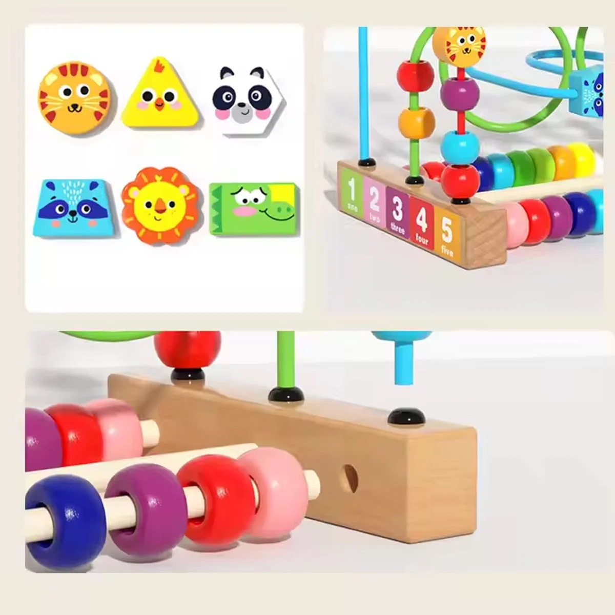 Labirint motricitate din lemn Animale, circuit cu bile, numere si abac, multicolor